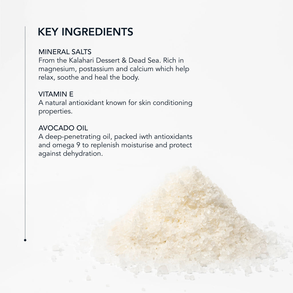 Salts from Kalahari Desert and Dead Sea, among the most fertile sources of the natural minerals and trace elements such as magnesium, potassium, and calcium, are essential for the maintenance of healthy skin, nails, and hair.